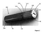 図3および図4に示すカートリッジ組立品200は、カートリッジ204と、カートリッジカバー206と、マウスピース208とを含む。カートリッジ204、カートリッジカバー206およびマウスピース208はそれぞれ、動作部分を含み、それはカートリッジ204に対するカートリッジカバー206およびマウスピース208のそれぞれのらせん状の移動を画定する。したがって、機能上、図3および図4に示すカートリッジ組立品208は、図1および図2に示すカートリッジ組立品2と同様である。すなわち、カートリッジカバー206およびマウスピース208を相反する回転方向に回転させることは、カートリッジ204に対する第一の位置と第二の位置との間のカートリッジカバー206のらせん状の移動、およびカートリッジ204に対する第三の位置と第四の位置との間のマウスピース208のらせん状の移動をもたらす。  The