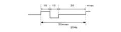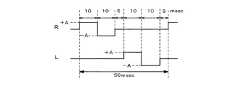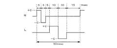 図7に、両眼の同時治療の場合の刺激パターンを示す。この刺激パターンは、図5の場合と同様であるが、右眼の刺激と左眼の刺激との間に5msecの休止時間を設けている。これにより、共用の電極23を用いて効果的に両眼を同時に治療することができ、片眼ずつ治療する場合に比べて、治療時間を半減することがきる。すなわち、右眼と左眼に同時に電気刺激を加えると、右眼用および左眼用の電極21、22と共用の電極23との間で電流の流れやすい方(すなわち、抵抗の低い方)に電流が流れ、両眼の同時治療を適正に行うことができない。  FIG. 7 shows the stimulation pattern in the case of simultaneous treatment of both eyes. This stimulation pattern is the same as in the case of FIG. 5, but a rest time of 5 msec is provided between the stimulation of the right eye and the stimulation of the left eye. As a result, both eyes can be effectively treated at the same time using the shared