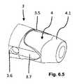 拡張器4の内腔は、図5.1に示すように、特に拡張器4の右の遠位端部において、あるいは図6.3の左の近位端部においても分かるように、シリンダ状である。すなわち近位および遠位の入口開口部ないし出口開口部は円錐形である。拡張器4もその近位の外側に横溝4.3を有する。  The lumen of the