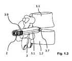 同様に特に図3から分かるように、上方と下方の長辺3.3,3.4の壁厚は短辺3.5,3.6の壁厚よりも小さい。典型的に図示の実施例では上方と下方の長辺3.3,3.4の壁厚は約1mmであり、一方、短辺3.5,3.6の壁厚は約1.5mmである(図3の図示は拡大して示されている)。短辺3.5,3.6の遠位端部には−遠位−突起3.7が形成されている(図1,4.1〜4.2)。これらの突起は、一方では案内スリーブを2つの椎骨1.1と1.2の間で堅固に係留するために、他方では中間空間を拡張し、ケージ2を2つの椎骨1.1,1.2の間に導入することができるようにするために用いられる。突起3.7は短辺3.5,3.6の継続部を形成するから、突起3.7における短辺3.5,3.6の比較的に大きな壁厚によって比較的に高い安定性が付与され、したがってこれにより、案内スリーブ3の確実な係留と椎骨1.1,1.3の間の中間空間の拡張と言う課題をより確実に達成することができる。  Similarly, as can be seen particularly from FIG. 3, the wall thicknesses of the upper and lower long sides 3.3 and 3.4 are smaller than the wall thicknesses of the short sides 3.5 and 3.6. Typically, in the illustrated embodiment, the upper and lower long sides 3.3, 3.4 have a wall thickness of about 1 mm, while the short sides 3.5, 3.6 have a wall thickness of about 1.5 mm. Yes (the illustration in FIG. 3 is shown enlarged). -Distal-protrusions 3.7 are formed at the distal ends of the short sides 3.5 and 3.6 (Figs. 1, 4.1-4.2). These protrusions, on the one hand, anchor the guide sleeve tightly between the two vertebrae 1.1 and 1.2, and on the other hand, extend the intermediate space and