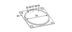 光源23は、図4に示すように、COB(Chip On Board)モジュールによって構成されている。光源(COBモジュール)23は、基板25、この基板25に実装された複数の発光素子(LED)26、およびこれら発光素子26を覆う蛍光体層27を備えている。基板25上には発光素子26の実装領域の周囲に円環状の枠状部28が設けられ、この枠状部28の内側に蛍光体層27が充填されている。蛍光体層27の表面が光を発光する発光部の発光面29であり、この発光面29は円形で所定の直径D1に形成されている。また、図1に示すように、光源23は、光源ホルダ30に保持され、絶縁性を有する熱伝導シート31を介して放熱器24の前面に取り付けられている。光源ホルダ30の中央には、光源23の発光面29に対向するとともに前方へ向けて拡開する円形の光源開口32が形成されている。  As shown in FIG. 4, the