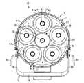 そして、本実施形態では、6つの光源23が用いられ、5つの光源23が灯体11の周辺域に周方向に沿って等間隔に配設され、1つの光源23が灯体11の中央域に配設されている。そして、これら光源23は、同一構成のものが用いられ、つまり、発光面29の大きさ(直径D1)が同じものが用いられている。なお、光源23であるCOBモジュールにおいては、発光面29の直径D1が大きいほど発光効率が高い特性を有するため、発光面29の直径D1が大きいものを用いることが好ましい。  Then, in the present embodiment, six