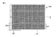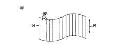図8は、基材96の表面上の平行な微小導体95を有する、微小複製され、充填された「ストック」構成材料を示す。ウェブの配向は、縦(verticle)である(97)。本明細書において、並びに/又は3Mの特許出願第61/076731号(「Method of Forming a Microstructure」)及び同第61/076736号(「Method of Forming a Patterned Substrate」)に開示されるように、基材は、PET、PEN、又はポリカーボネートであってもよく、微小導電体が、微小複製された溝に堆積されてもよい。微小導電体の間隔は、一実施形態では、好ましくは、50μm〜500μmである。  FIG. 8 shows a micro-replicated and filled "stock" constituent material having