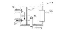 転化部30は、検知対象ガスを酸化して生成した転化ガスを検出するように構成するため、加熱触媒部30Aおよびセンサ素子部30Bを有する。本実施形態の転化部30はケーシング1の内部空間の一部として構成してある。即ち、当該ケーシング1は、その内部を拡散手段20によって仕切ってあり、仕切られた空間の一方を転化部30とし、他方をガス流路10の一部としてある。ケーシング1は円柱状や立方体状等、どのような形状であってもよい。本実施形態では、検知対象ガスがガス流路10を流下する方向と、検知対象ガスの一部が拡散手段20を透過して転化部30の内部へ自然拡散する方向とが異なる(略直交する)ように構成してある場合について説明する。この場合、ガス流路10を流下する検知対象ガスの少なくとも一部を、より当該流圧の影響を受け難い状態で拡散手段20の孔を通過して転化部30の内部へ自然拡散させ易くなる。  The