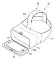 装着具11は、開口11dが形成されたゴーグル型の筐体11aと、この筐体11aに取り付けられた第1ベルト11b及び第2ベルト11cと、蓋11eと、を有する。蓋11eは、筐体11aに開閉自在に取り付けられている。筐体11aの前方には開口11dが形成されている。図2においては、蓋11eは開放されている。HME10の使用時には、蓋11eは、開口11dを閉塞するように閉じられる。  The fitting 11 has a goggle-shaped