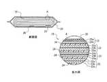 図2は、蓄電池2に搭載される単位電池の一例を示す断面図とその拡大図である。図2に示すように、単位電池は、外装部材20と、外装部材20に収納された扁平上の捲回電極群21と、を有する。捲回電極群21は、正極22と負極23をその間にセパレータ24を介在させて渦巻状に捲回された構造を有する。非水電解質(図示しない)は、捲回電極群21に保持されている。図2に示すように、捲回電極群21の最外周には負極23が位置しており、この負極23の内周側にセパレータ24、正極22、セパレータ24、負極23、セパレータ24、正極22、セパレータ24というように正極22と負極23がセパレータ24を介して交互に積層されている。負極23は、負極集電体23aと、負極集電体23aに担持された負極活物質含有層23bとを備えるものである。負極23の最外周に位置する部分では、負極集電体23aの片面のみに負極活物質含有層23bが形成されている。正極22は、正極集電体22aと、正極集電体22aに担持された正極活物質含有層22bとを備えるものである。図2に示すように、帯状の正極端子25は、捲回電極群21の外周端近傍の正極集電体22aに電気的に接続されている。一方、帯状の負極端子26は、捲回電極群21の外周端近傍の負極集電体23aに電気的に接続されている。正極端子25及び負極端子26の先端は、外装部材20の同じ辺から外部に引き出されている。  FIG. 2 is a cross-sectional view showing an example of a unit battery mounted on the