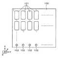 また、本実施の形態で用いられるワークWには、図3に示すように区画壁であるバンク100が形成される。バンク100は、例えばフォトリソグラフィー処理やエッチング処理等を行うことによって所定のパターンにパターニングされる。バンク100には、略矩形状の開口部101が行方向(Y軸方向)と列方向(X軸方向)に所定のピッチで複数並べて形成されている。この開口部101の内部は、液滴吐出装置1により吐出された液滴が着弾する着弾領域となる。なお、バンク100には、例えば感光性ポリイミド樹脂が用いられる。  Further, in the work W used in the present embodiment, a