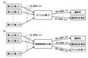 図5(a)に示すように、フリーランスf1が講師を招く際に支払う講師料は、フリーランスf1のフリーランス口座f1から支出される100,000ポイントで支払われるが、実際には、図2で示す外部支出入管理部12cを介することにより、100,000ポイントに相当する現金10万円に交換され講師に支払われる。また、講演会場となる会議室の使用料(例えば50,000ポイント)等も、企画者であるフリ―ランス口座f1から、会場となる会議室等を管理する部署の部署口座に支払われる。よって、聴講者が支払うポイント額の設定は、これらの講演会を開催する際の全ての経費を考慮して算出される。そして、講演会を開催する際し必要な上記経費(100,000ポイント+50,000ポイント)が差し引きされた残り(150,000ポイント)が、フリーランスf1の業務の対価としてフリーランス口座f1に蓄積される。  As shown in FIG. 5A, the instructor fee paid when freelance f1 invites an instructor is paid by 100,000 points paid from the freelance account f1 of freelance f1, but in reality, the figure Through the external