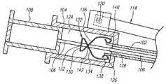 一実施形態では、針保護部122と針106は、近位壁130の近位開口部132でのみ互いに接触している。また、他の実施形態では、針保護部122と針106は、2つのアームの交差部(または交差点)142でのみ互いに接触している。したがって、可撓性チューブ102から針106を後退させる間、近位壁の開口部132でのみユーザに抵抗力が作用する(またはユーザが抵抗力を感じる)。2つの端部138,140は、針106のすべて(または大部分)が可撓性チューブ102と第1ハブ104から後退する間、例えば空隙もしくは空間または支持部126により、針106から隔てられた位置にある。  In one embodiment, the
