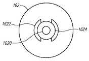 図10を参照する。本開示の態様に従って提供されるバルブ開放部の端面図が示されている。バルブ開放部は、バルブ開放部の先端の開口部1620の周りに形成され、分離された2つ以上の部分(例えば2つ以上のリブ)として形成された支持部1624を有する。2つ以上のリブの形状は、略長方形状、略弧状またはそれらの組み合わせであってもよい。支持部1624は、針保護部122の端部138,140のための嵌合面を有し、準備完了位置から使用位置において当該嵌合面の上に配置されてもよい。Referring to FIG.10. An end view of the valve opening provided according to aspects of the present disclosure is shown. The valve opening has a