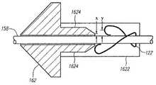 支持部1624の上に針保護部122を実装するための1つの方法は、準備完了位置において、2つのアーム134,136が針シャフトから離れて位置するように、バルブ開放部の支持部1624の上に、針保護部122の遠位端をスライド移動させるステップを含む。図7を参照して、針保護部122が支持部1624上で確実にスライドできるように、針シャフトと支持部1624の外面との距離xを、針シャフトと針保護部122の転移点との距離yよりも小さくするべきである。転位点は、針保護部122の端部138,140の湾曲が最も大きくなり且つ内側に湾曲を始め、これにより、端部138,140の湾曲面が支持部1624の外面に係合すると共に、互いに針シャフトから離れて広がり、支持部1624に対して付勢されることが可能な山(または谷)であってもよい。支持部1624と針シャフトとの距離xが針シャフトと転移点との距離yよりも大きい場合、距離xが距離yよりも大きくなるまで支持部1624は先細りしていてもよい(図7、図8を参照)。一実施形態では、例えば凹部を設けることにより、支持部1624の外面は端部からバルブ開放部の本体に向かって内側に先細りし(図8を参照)、これにより針保護部の2つの端部が当該空間内で支持部に対してより確実に固定される。これは、針保護部122が意図しないほど早くバルブ開放部の支持部1624から分離されるのを防止することに役立つ。別の実施形態では、支持部1624は、溝部(図8を参照)、または、針保護部122が意図しないほど早くバルブ開放部の支持部1624から分離されるのを防止する他の抵抗手段を有する。明らかであるが、図7、図8に示すバルブ開放部は、本明細書で開示している、バルブを有する他のカテーテルアセンブリのいずれかと一緒に用いてもよい。One way to mount the