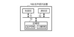 ユーザを基準として仮想話者の位置を音発生源とする音場を再現してもよい。具体的には、音声再生装置200が複数のスピーカを実装し、それぞれのスピーカからの放音タイミングを時間的に遅延させることで、仮想話者の音声がどの方向から聞こえてくるかという音像定位が可能な音場を実現できるようにする。音声提供装置100の提供部104は、ユーザと仮想話者との位置関係に応じた音像定位を実現するための音場パラメータ(具体的には各スピーカからの放音タイミングの遅延時間)を音声再生装置100に提供する。つまり、提供部104は、仮想話者の音声とともに、ユーザの位置と仮想話者の位置との関係に応じて上記音声の放音処理を行うための音場を提供するための処理を行う。このようにすれば、ユーザは仮想話者がどちらの方向に居るかということを感じることができる。[Modification example]