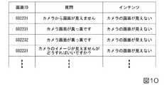 図10は、学習モデル31の機械学習を行うための学習用データの例を示す概略図である。図示するように、学習用データは、画面ID(画面識別情報)と、質問と、インテンツ(意図情報)との組の集合のデータである。図示するデータ例における第1行目は、画面IDが「G02231」、質問が「カメラから画像が見えません」、インテンツが「カメラの画像が見えない」というデータである。機械学習処理部32は、図10に示すような構造を持つ大量のデータを、学習用データとして学習モデル31に供給することにより、学習モデル31の機械学習を行う。このような機械学習により、学習モデル31は、画面IDと質問が与えられたときに、それらに対応するインテンツを推定できるようになる。  FIG. 10 is a schematic diagram showing an example of learning data for performing machine learning of the