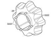 て、回転ホイール28の回転は、内側成形物314の回転を引き起こし、該回転は、続いて駆動シャフト316及びカラー成形物310を回転させる。安定のために、回転ホイール28は、クラムシェル成形物300、302と一体である内側合わせ面(不図示)上で回転式に滑動する円筒状の面1204を含む。As described above, the