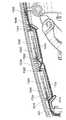 上述のように、挟持部14は、湾曲されてよい。刃340が、十分な切断能力を尚も維持しつつもこの湾曲に沿って推し進められることを可能にするためには、湾曲した走路を通る切断刃340の摩擦力が、最小限に抑えられなければならない。摩擦力は、走路342内における刃340の摩擦係数と、刃340が走路342の壁に及ぼす曲げに起因する力との積である。この摩擦力は、例えば、刃の側面に低摩擦コーティングを追加することによって、及び/又は刃が切断力の方向には剛性を維持しつつ走路342に沿って曲がることができるように刃340を選択的に弱体化させて刃の遠位端の柔軟性を徐々に変化させることによって、低減されてよい。選択的弱体化は、例えば、図3及び図47a〜cに示されるように、遠位端に1つ以上の孔354を提供することによって、又は図47dに示されるように、刃340の厚さを徐々に変化させることによって、提供されてよい。或いは、図47eによって示されるように、刃の長さにわたる曲げ剛性を制御するために、遠位端におけるパターン形成されたレーザ切断部分4712又は化学エッチング部分が使用されてよく、このような切断部分間の間隔は、遠位端から近位端にかけて一定であってよい又は徐々に増してよい。  As described above, the sandwiching