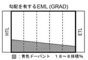 幾つかの実施形態においては、前記有機発光デバイスは、前記発光層(EML)と前記アノードとの間に設けられ、前記EMLと直接接触し、HTL/EML界面を形成するホール輸送層(HTL)と、前記EMLと前記カソードとの間に設けられ、前記EMLと直接接触し、ETL/EML界面を形成する電子輸送層(ETL)と、を更に含み、前記第1のドーパントが、線形的勾配を有する濃度レベルで前記発光層に存在し、前記線形的勾配を有する濃度レベルは、前記HTL/EML界面で最大濃度レベルであり、前記ETL/EML界面で最低濃度レベルである。 In some embodiments, the organic light emitting device is provided between the light emitting layer (EML) and the anode and is in direct contact with the EML to form an HTL / EML interface, a hole transport layer (HTL). And an electron transport layer (ETL) provided between the EML and the cathode and in direct contact with the EML to form an ETL / EML interface, wherein the first dopant has a linear gradient. The concentration level present in the light emitting layer at the concentration level having the above and having the linear gradient is the maximum concentration level at the HTL / EML interface and the lowest concentration level at the ETL / EML interface.