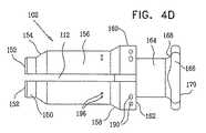 ここで、手動係合可能要素102を示す図4A〜4Eがさらに参照される。手動係合可能要素102は、好ましくは、前方向きのほぼ円形状のエッジ152を有するほぼ円筒状の前方部分150を含む、DELRIN(登録商標)またはステンレス鋼のような成形または機械加工された硬質プラスチックまたは金属で好ましくは形成されている一体形成されたほぼ円形状の対称本体を備える。前方部分150の後方には、好ましくは、後方に向かって増加する外径を有する前方のほぼ円錐状の移行部分154が設けられている。  Here, FIGS. 4A-4E showing the manually