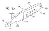 ここで、アーム要素108を示す図5A〜5Cをさらに参照する。特に図5A〜5Cに見られるように、各アーム要素108は、第1の比較的大きい厚さをもつ後方部分200と第2の比較的小さい厚さをもつ後方部分202とを含むほぼ平面状要素である。  Here, FIGS. 5A to 5C showing the