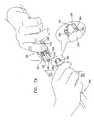 図7Bおよび8Bは、カラー304が装置100と対向した状態で、一方の手で装置100を保持し、他方の手で補助内視鏡アセンブリ300を保持するユーザを示している。この段階で、駆動用アセンブリ106は、手動係合可能要素102に対して完全に引き込められていることに留意する。この段階で、ユーザの手は、アーム要素108の外向きエッジ面206および220にかけられて、アーム要素108のカラー係合エッジ面212がほぼ先端が切り取られていない錐体を画定し、それによって、図7Cおよび8Cに見られるようにカラー304内に挿入され、カラー304を部分的に伸張させることができるように可能な限り最大に、スプリング114による付勢に対抗して、アーム要素108の外向きエッジ面206および220を半径方向内向きに押すことにも留意する。  7B and 8B show a user holding the