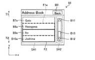 なお、パネル50は表示部の一例である。多機能機10は画像表示装置の一例である。画像表示プログラム18はプログラムの一例である。CPU14はコンピュータの一例である。スクロール領域SA1は、第1表示領域の一例である。リスト画像は、オブジェクト画像の一例である。S102を実行するCPU14は、第1表示手段の一例である。「押下開始」イベントは、第1操作の一例である。S136、S138を実行するCPU14は、第1決定手段の一例である。S140を実行するCPU14は、第2表示手段の一例である。「指示座標移動」イベントは、第2操作の一例である。S157、S167、S174を実行するCPU14は、切替手段の一例である。S160、S170、S175を実行するCPU14は、第3表示手段の一例である。「離反」イベントは、第3操作の一例である。S210を実行するCPU14は、抽出手段の一例である。S220を実行するCPU14は、第4表示手段の一例である。S128を実行するCPU14は、処理実行手段の一例である。スクロールバー領域SA2は、第2表示領域の一例である。S102を実行するCPU14は、スクロールバー表示手段の一例である。上方向T1は、第1スクロール方向の一例である。下方向T2は、第2スクロール方向の一例である。空白リスト画像BBは、余白画像の一例である。氏名102は、識別情報の一例である。FAX番号103は、付帯情報の一例である。  The