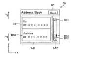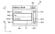 スクロール領域SA1に2個のリスト画像を表示する場合には、図6に示すように、リスト画像には、氏名102およびFAX番号103が1行ずつ表示される。これによりユーザは、氏名102によってFAX送信先を識別することができるとともに、氏名102に紐付けられているFAX番号103の内容も確認することができる。また、スクロール領域SA1に4個のリスト画像を表示する場合には、図7に示すように、リスト画像には、氏名102のみが1行で表示される。よって、リスト画像に表示される情報を、FAX送信先を識別するために必要な最低限の情報に絞ることができる。これにより、リスト画像を小さくすることができるため、スクロール領域SA1内に表示可能なリスト画像の数を増加させることができる。  When displaying two list images in the scroll area SA1, as shown in FIG. 6, the
