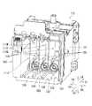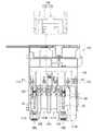 図3及び図10に示されるように、ゲート108(凸部の一例)が、カートリッジケース101の天面付近且つ前後方向において、光センサ113と接点106との間に設けられている。ゲート108は、挿入空間111の左右方向の両端に位置するプレート104などの仕切部材から、左右方向に間隔を空けて対となり、左右方向に沿って延び、且つ挿入空間111へ向かって下方に延びる2つの障壁118と、障壁118同士の間に形成された当該所定の間隔を空けて形成された空間であって、障壁118における左右方向の所定の位置の下端から上方へ向かって延びるスリット119と、を有するものである。ゲート108におけるスリット119の左右方向の位置が、各挿入空間111C,111M,111Y,111Bにおいて異なる。スリット119は、各インクカートリッジ30C,30M,30Y,30Bにそれぞれ設けられた遮光板67C,67M,67Y,67Bの左右方向の配置に対応しており、各遮光板67C,67M,67Y,67Bの左右方向の幅より広い。すなわち、各遮光板67C,67M,67Y,67Bは、スリット119を前後方向に通過することができる。[Gate 108]