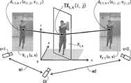 以上、本発明によれば、インデクスkで指定される順番で逆投影面Pt,k(i,j)に描画することにより、及び、合成映像SYt(u,v)を得る際のレンダリングに関してアルファ値等によるカメラ間での配分を行うことにより、先行手法としての特許文献1における自由視点映像合成のもつ高速な処理形態(リアルタイム性)を損なわずに、オクルージョンによる品質低下の問題を解決することができる。以下、本発明における説明上の補足を述べる。As described above, according to the present invention, rendering is performed by drawing on theback projection planes P t, k(i, j) in the order specified by the index k, and when obtaining the composite image SY t (u, v). By allocating between cameras according to the alpha value, etc., the problem of quality deterioration due to occlusion is solved without impairing the high-speed processing form (real-time property) of free-viewpoint video compositing in