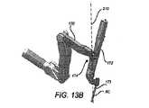 図13A、図13B、及び図13Cは、円錐スイープジョイント174が提供する運動の範囲を示す。図13Aでは、円錐スイープジョイント174は、器具ホルダ172が第2の平行四辺形リンク170と整列する、中心に位置合わせされた形態にある。図13Bでは、円錐スイープジョイント174は、一方向に完全に回転されて示され、それによって器具ホルダ172は図示された方向に配向している。そして、図13Cでは、円錐スイープジョイント174は、反対方向に完全に回転されて示され、それによって器具ホルダ172を図示された反対方向に配向している。図示されるように、円錐スイープジョイント174によって提供される器具ホルダ172の異なる可能な配向は、器具ホルダ172によって支持される手術器具(図示せず)のための対応する異なる挿入方向を提供するのに役立つ。同様に、円錐スイープジョイント174が提供する冗長自由度は、各個別の器具位置に対するマニピュレータのある範囲のジョイント位置を可能にする。図示されていないが、図11に示された近位円錐スイープジョイントが同様の機能を提供することを理解することができる。加えて、共に機能する2つの円錐スイープジョイントは、器具を静止したままにしながら、ヨージョイント及び平行四辺形機構を一方の側又は他方にオフセットさせることができる。器具ボディに対してエンドエフェクタをロールさせること(例えば、シャフトのエンドエフェクタをロールさせること、又は取り付けられたエンドエフェクタとともにシャフト全体をロールさせること)は、マニピュレータが動くとき、エンドエフェクタを空間内で静止させたままにすることを可能にする。したがって、遠隔手術中、冗長自由度の利点を利用するマニピュレータの動きは、外科医に透明であり、この外科医は、如何なる対応する手術エンドエフェクタの動きも知覚しない。  13A, 13B, and 13C show the range of motion provided by the conical sweep joint 174. In FIG. 13A, the conical sweep joint 174 is in a centered configuration in which the
