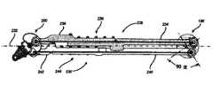 図14Bは、マニピュレータ160の第1の平行四辺形ジョイント192及び第2の平行四辺形ジョイント198を回転結合する第3のサイン/コサインリンク246及び第4のサイン/コサインリンク248を示す。第3及び第4のサイン/コサインリンク246、248は、第1及び第2のサインコサインリンク228、230と同様に構成されるとともに平行四辺形ジョイント192、198に結合されるので、同じ説明が当てはまり、ここでは繰り返さない。図14Bは、方向付けされた湾曲部250、252を示し、これらは、第3及び第4のサイン/コサインリンク246、248における動作可能な力−抵抗レベルを減らすように構成される(及びまた、第1及び第2のサイン/コサインリンク228、230における動作可能な力−抵抗レベルを減らすように使用されることができる)。方向付けされた湾曲部250、252のそれぞれは、方向付けされた湾曲部が取り付けられたサイン/コサインリンクと整列する(第2の平行四辺形ジョイント198への第4のサイン/コサインリンク248の接続において示されるように)硬い配向及び方向付けされた湾曲部が取り付けられたサイン/コサインリンクに垂直に配向される(第1の平行四辺形ジョイント192への第3のサイン/コサインリンク246の接続において示されるように)柔軟な配向を有する片持ち梁として構成される。方向付けされた湾曲部250、252は、取り付けられたサイン/コサインリンクが、トルクの伝達のための最大の機械的利点を提供するとき、提供される荷重経路の剛性が最大化されるように、及び取り付けられたサイン/コサインリンクが、トルクの伝達のための最小の機械的利点を提供するとき、提供される荷重経路の剛性が最小化されるように構成される。  FIG. 14B shows a third sine / cosine link 246 and a fourth sine /