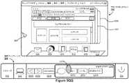 いくつかの実施形態においては、フォーカスの変更により、ディスプレイ部分110のプライマリディスプレイ102(又は図2A〜図2Dの外付けディスプレイデバイス204)上に表示されたグラフィカルユーザインタフェースのどの要素がアクティブであり、どの要素がユーザ入力を受け取るかが変わる。このユーザ入力は、キーボード、マウス、タッチパッド、又は他のユーザ入力デバイスから受け取られ得る。加えて、及び/又は代替として、いくつかの実施形態においては、フォーカスの変更により、ディスプレイ部分110のプライマリディスプレイ102上に表示されたグラフィカルユーザインタフェースの前景(又は図2A〜図2Dの外付けディスプレイデバイス204)内に示される要素が変わる。  In some embodiments, the change of focus activates which element of the graphical user interface displayed on the primary display 102 (or the