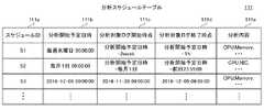 分析指示取得部102は、分析スケジュールテーブル111を定期的に参照し、分析スケジュールの実行時刻が来た分析スケジュールが存在していると、実行時刻となった分析スケジュールの情報を取得し、取得した情報を、分析対象判断部103に渡す。  The analysis