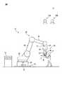 なお、本実施形態において、検出装置16Bが検出する作業員Aの所定の動作は、図4に示す接近動作、図5に示す把持動作、又は図7に示すタップ動作であってもよい。また、本実施形態においては、ロボット52が作業対象物Vを締結する作業を行う場合について述べた。しかしながら、これに限らず、ロボット52は、例えば、作業対象物に対して溶接作業を行うものであってもよいし、又は、他の如何なる作業を行うものであってもよい。ロボット52が溶接作業を行う場合、ロボット52のエンドエフェクタ54は、溶接トーチを有し得る。  In the present embodiment, the predetermined operation of the worker A detected by the