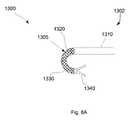 図8A〜図9Cは、本明細書に記載のツール中に組み込みが可能な柔軟性セクションの諸実施形態を示す。図8Aは、ツールの別の実施形態を示す。このツール1300は、ツールシャフト1302の一部に沿った屈曲部または肘部を含むことができる。ツール1300は、1つ以上の剛性セクション1310を含むことが可能である。ツール1300は、1つ以上の柔軟性セクション1305を含むことが可能である。柔軟性セクション1305は、シース1320を含み、シースは、平行線模様で図示されている。ツール1300は、エンドエフェクタ1340(例えば捕捉具)を含むことができる。ツール1300は、例えば、障害物を迂回して所望の位置または対象物に到達するため、非直線の形状を実現するように、屈曲するまたは別途に操作することが可能である。さらに、ツール1300は、柔軟性セクション1305を選択的に硬化および/または所定位置にロック(例えば、前記屈曲形状を維持するために)できるようにアレンジされることができる。  8A-9C show embodiments of flexibility sections that can be incorporated into the tools described herein. FIG. 8A shows another embodiment of the tool. The