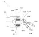 補捉具310の顎310A、310Bのペアは、顎310A、310Bが軸370の周りを回転可能なように、プーリ320A、320Bの第3セットを介して第2ヨーク330に連結することができる。一実施形態において、顎310Aは、プーリ320Aに連結される。別の実施形態では、顎310Aは、プーリ320Aに一体化して形成することが可能である。同様に、一実施形態において、顎310Bは、プーリ320Bに連結される。別の実施形態では、顎310Bは、プーリ320Bに一体化して形成することが可能である。顎310Aおよびプーリ320Aは、軸370の周りを回転することができる。同様に、顎310Bおよびプーリ320Bも、軸370の周りを回転することができる。この図示の実施形態において、捕捉具310は、ツール30のエンドエフェクタである。但し、他の実施形態では、エンドエフェクタは、外科手術(例えば、経皮外科手術)において用いられる諸メカニズムなど、他の適切なメカニズムとすることも可能である。  The pair of