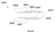 図4Dは、ツール30などのツールのケーブルを制御するための別の駆動メカニズム500Cを概略的に示す。このシステムは、2つのケーブル595A,595Bを含む。各ケーブル595A,595Bは、プーリ597A、597Bに関連付けられる。プーリ597A、597Bは、駆動される対象である。各ケーブル595A,595Bは、2つのケーブル端を有する。各ケーブル端は、モータ590A、590B、590C、590Dによって駆動される。これらのモータは、扁平な高トルクモータ(電気モータ)とすることができる。他の実施形態において、他の種類のモータを用いることは、可能である。ケーブル595A、595Bを巻き取り、巻き解くスプールは、図示されていない。  FIG. 4D schematically shows another