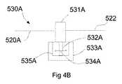 図4Bは、移行ブロック530Aを示す。一実施形態において、全4つの移行ブロック530A、530B、530C、および530Dは、移行ブロック530Aと同様の特徴を有する。撚り紐ペア520Aは、終端ブロック531Aに連結されている。また、ケーブル522も、終端ブロック531Aに連結されている。終端ブロック531Aは、ペグ532Aに固定的に連結されている。一実施形態において、終端ブロック531Aは、ペグ532Aと一体化して形成することが可能である。  FIG. 4B shows the