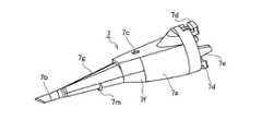 挿入筒本体7aは、挿入筒7の軸方向で第1の部分7fと第2の部分7gに分けられる。第1の部分7fは、挿入器本体5のレンズ設置部11を収容可能な内部空間を有するもので、第2の部分7gよりも幅広に形成されている。第2の部分7gは、第1の部分7fよりも前方に位置している。挿入器本体7aの内部空間は、ロッド10で眼内レンズ4を押し出したときに、眼内レンズ4を小さく折り畳むために、第1の部分7fから第2の部分7gにかけて徐々に狭くなっている。  The insertion cylinder