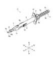 一方、特許文献3には、器具本体と押出軸とねじ筒とを備えた眼内レンズ挿入器具が記載されている。この眼内レンズ挿入器具では、器具本体に雄ねじ、押出軸に雌ねじを形成している。そして、ねじ筒を回動(回転)操作したときに、雄ねじと雌ねじの噛み合わせ(螺合)により押出軸が移動し、押出軸の末端部を押圧(押し込み)操作したときにも、押出軸が移動する構成になっている。  On the other hand,
