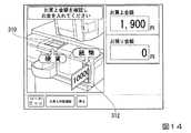 図13に示した支払い方法を選択させるための画面において、支払い方法として「現金」が選択された場合、精算装置30は、預り金額等を表示する画面を表示する。図14は、精算装置が表示する精算画面(預かり金額等を表示する画面)を示した図である。図示する例では、決済端末310の位置を示すガイダンス「硬貨」、及び決済端末312の位置を示すガイダンス「紙幣」が点滅する画像と、模擬紙幣が決済端末312に投入される画像と。お買上金額と、お預り金額とが表示されている。これにより、顧客は、決済端末312の位置を容易に把握することができる。また、顧客は、お買い上げ金額と、お預り金額とを把握することができる。  When "cash" is selected as the payment method on the screen for selecting the payment method shown in FIG. 13, the