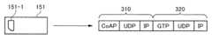 図3は、機器から送信される初期設定要求の一例を説明するための図である。機器151からは、CoAP/UDP/IPのそれぞれのプロトコルに従った第1のデータ310が初期設定要求として送信され、セルラーネットワークにおいてGTP/UDP/IPのそれぞれのプロトコルに従った第2のデータ320が付加されて通信装置110によって受信される。CoAPプロトコルに従うCoAP領域において、LwM2Mプロトコルに従ったブートストラップリクエストとして「POST /bs」がエンドポイントとともに記述される。UDP領域には、機器151で動作するソフトウェアのポート番号が記述され、IP領域には、送信先である第1の管理装置131のIPアドレス及び送信元である機器151のIPアドレスが記述される。  FIG. 3 is a diagram for explaining an example of an initial setting request transmitted from the device. From the