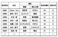 図2の領域R2には、参加者が活用することができる各種の情報が表示される。具体的には、領域R2には、参加者が参加しているグループ会議への参加者の一覧が表示されたり、担当者との間でやり取りするチャットメッセージが表示されたり、会場のレイアウトを示すマップが表示されたりする。図2においては、参加者がブースB4のグループ会議を選択したことに応じて、ブースB4のグループ会議に参加している参加者の一覧が表示されている。 Various types of information that can be utilized by the participants are displayed in the area R2 of FIG. Specifically, in the area R2, a list of participants in the group meeting in which the participants are participating is displayed, a chat message exchanged with the person in charge is displayed, and the layout of the venue is shown. The map is displayed. In FIG. 2, a list of participants participating in the group meeting of booth B4 is displayed according to the participants selecting the group meeting of booth B4.