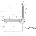付勢部材80は、ガスケット70の後部に連続しており、ガスケット70の後部からやや背面側へ突出した突出部81を有する。なお、図4に示すとおり、ベースフレーム41の上端部41b及び周壁部41aの上部は概ね全周に亘って延びているが、後部において一部が切り欠かれている。突出部81は、この切り欠きを通り、ベースフレーム41の径方向内側から外側に達する。  The urging