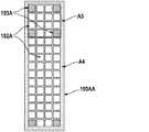 図4Bは、図4Aに示される実施形態に似た基板100AA上に実装された4×15のLEDダイの行列の例示的な一実施形態を示しており、処理光パルスを放射するように構成された54個の複数の第1のLEDダイ102Aに加えて、6個の複数の第2のLEDダイ103Aが、第1の選択可能な活性領域A3又はより大きい第2の選択可能な活性領域A4を示すために可視波長範囲で発光するように配列されている。このような長方形のLEDダイのアレイは、図4Aに示されるようなLEDダイアレイを使用することができるように1つの皮膚処理領域から別の皮膚処理領域へと順次動かされる代わりに、皮膚に沿って連続的に動かされる皮膚処理装置に特に使用される。このような滑らかな動きは、特に長方形のLEDダイアレイの長軸に垂直な方向に特に生じ得る。特定の実施形態では、滑らかに使用される皮膚処理装置は、皮膚に沿って装置が動かされる速度を測定するための速度センサを有することができる。したがって、この皮膚処理装置を、測定された滑らかな運動の速度に応じて連続した処理光パルス間の時間を制御するように構成することで、処理光パルスが皮膚に途切れることなく(すなわち、隙間や重なり合いを基本的に生じることなく)照射されるようにすることができる。長方形の形状のため、より小さい活性領域A3がLED行列の幅全体をカバーしており、これにより、より小さい活性領域A3を処理領域上に正確に位置決めする助けとなる。 FIG. 4B shows an exemplary embodiment of a matrix of 4 × 15 LED dies mounted on a substrate 100AA similar to the embodiment shown in FIG. 4A, configured to radiate processed light pulses. In addition to the 54 first selectable LED dies 102A, the six second selectable LED dies 103A have a first selectable active region A3 or a larger second selectable active region. They are arranged to emit light in the visible wavelength range to indicate A4. Such a rectangular array of LED dies is along the skin instead of being moved sequentially from one skin treatment area to another so that the LED die array as shown in FIG. 4A can be used. Especially used for skin treatment devices that are continuously moved. Such smooth movement can occur especially in the direction perpendicular to the long axis of the rectangular LED die array. In certain embodiments, the smoothly used skin treatment device can have a speed sensor for measuring the speed at which the device is moved along the skin. Therefore, by configuring this skin treatment device to control the time between continuous treatment light pulses according to the measured rate of smooth movement, the treatment light pulses are uninterrupted in the skin (ie, crevices). It can be made to be irradiated (without essentially causing overlap). Due to the rectangular shape, the smaller active region A3 covers the entire width of the LED matrix, which helps to accurately position the smaller active region A3 on the processing region.
