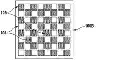 図5は、8×8のLEDダイの行列の例示的な一実施形態を示しており、32個の第1の部分複数の第1のLEDダイ104と、32個の第2の部分複数の第1のLEDダイ105とが基板100B上に市松模様のパターンで実装されている(例えば、実装された基板領域にわたってLEDダイが基本的に均一に分布することになる)。詳細には、実装されたLEDダイのアレイが操作時に処理される皮膚に近接して配置される場合、第1の部分複数の第1のLEDダイ、又は第2の部分複数の第1のダイのどちらかのみを作動させることにより、実質的に均一な照明を実現することができる。第1の部分複数の第1のLEDダイ104を第1の波長で発光するように構成することができ(詳細には、少なくとも一時的な脱毛に充分な強度レベルで)、第2の部分複数の第1のLEDダイを第1の波長とは異なる第2の波長で発光するように構成することができる。第2の部分複数の第1のLEDダイは、単独でも少なくとも一時的な脱毛に充分な放射光束で発光することができるが、第2のLEDダイは皮膚再生又は他の皮膚処理に充分な放射光束で発光することもできる。この実施形態には示されていないが、第2のLEDダイは、図4Aを参照して説明されたように、選択可能な活性領域の隅の近くに配置されるものとして理解される。市松模様のパターンで配列される代わりに、第1及び第2の部分複数の第1のLEDダイを他の任意のパターンで配置することもでき、第2の部分複数の第1のLEDダイよりも多いか又は少ない第1の部分複数の第1のLEDダイを設けることができる(例えば、2個、7個、10個、16個、20個、40個など)。上記に述べたように、ここで示した8×8の行列はあくまで例示の目的のものにすぎず、少なくとも第1のLEDダイが通常の動作時に皮膚に10ms〜300msのパルス長を有するパルスで少なくとも1J/cm2の放射フルエンスを発生させるように配列されている限り(すなわち、第1のLEDダイが少なくとも3.333W/cm2で発光する(第1のLEDダイの活性アレイの領域が、同じサイズの皮膚領域を放射すると仮定する))、あらゆる任意の数の第1のLEDダイを、あらゆる任意のパターンで配列することができる。FIG. 5 shows an exemplary embodiment of a matrix of 8x8 LED dies, with 32 first portion plurality of first LED dies 104 and 32 second portion plurality. The first LED die 105 is mounted on the
