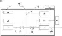 また、図2に示す態様では、更に、アンモニア分解器2もケーシング(I)に内設しているため、アンモニア分解器2から原料アンモニアが漏出した場合又は原料アンモニアを分解した混合ガス(以下、単に「混合ガス」ともいう。)としてアンモニアが漏出した場合であっても、アンモニア検知器(a1)がアンモニアの漏出を検知して、前述のとおり、速やかにアンモニア分解器2へのアンモニア供給を遮断器(b1)によって遮断することができる。
