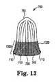 [0040]図7は、ハブ750に結合されている脚部710、720、730および740などの脚部を含む、蜘蛛型の基礎ステント700の斜視図を示す。例示的基礎ステント700は、米国特許出願公開第2011/0125091(A1)号(Abbate)に記載されている。そのような基礎ステントのモメタゾンフランカルボン酸エステル溶出バージョンが、現在、Intersect  ENT,  Inc.によるRESOLVE(商標)ステントとして、臨床試験の状態にある。その製造会社によれば、RESOLVEステントは、閉塞した副鼻腔をより良好に拡張させるために、PROPELステントに比べてより大きな径方向強度を有し、より長い期間に亘ってそのステロイドを放出する。また、強化された径方向強度のRESOLVE製品は、不要な頭痛症状を発生させる可能性がある。そのような症状は、基礎ステントの外向きの力および外向きの膨張を制限するように、RESOLVEステントの少なくとも部分を開示されている袖部で取り巻くことにより、軽減されるかまたは取り除かれる。例示的なそのような袖部は図12に示されており、そこでは、袖部1220が、脚部710、720、730および740の全長に沿って基礎ステント700を取り巻いている。別の例示的袖部が図13に示されており、そこでは、袖部1320が、脚部710、720、730および740などの脚部の端部1330のみを取り巻いている。  [0040] FIG. 7 shows a perspective view of a spider-shaped