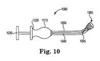 [0043]図10は、指当て部1020と親指押圧部1030とを備えた握持部1010を含む挿入装置1000の、部分的に断面図の側面図を示す。親指押圧部1030が指当て部1020に向かって前進させられた場合、作動装置1040およびその先端部1045は、挿入装置1000の遠位端に向かって、送達カニューレ1050を通って前進し、ステント1060の近位端に当接して力をかけ、ステント1060をカニューレ1050から外へ押し出し、意図された副鼻腔もしくは鼻腔内へ入れる。本明細書において開示されている挿入装置1000およびその他の挿入装置の実施形態は、挿入装置内にまたは挿入装置上の被覆内に、着色剤、放射線不透過性充填剤もしくは放射線透過性充填剤または他の添加剤を含んでいてもよく、可視化またはナビゲーションに役に立つ。  [0043] FIG. 10 shows a side view of a partially cross-sectional view of the
