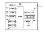 図3は、本発明の一実施形態における飛行ロボット2の構成を示すブロック図であり、飛行ロボット2は、飛行ロボット本体200、制御部201、記憶部202、通信部203、撮影部204、測距センサ205、高度センサ206、飛行ユニット部207、外部入出力部208、電源部209から構成される。  FIG. 3 is a block diagram showing the configuration of the