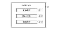図7は、本発明の実施の形態の少なくとも1つに対応する、プレイヤ端末の構成を示すブロック図である。プレイヤ端末3は、受付部301、第1抽選要求部302、及び第2抽選要求部303を少なくとも備える。  FIG. 7 is a block diagram showing a configuration of a player terminal corresponding to at least one of the embodiments of the present invention. The