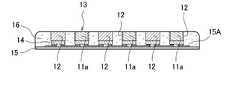 また、発光素子14が行列状に配置する場合、図2の矢印A方向からの側面視において、光学部品13の切断面11aと遮光膜12とが列方向に交互に並ぶように、光学部品13を固定した発光素子14を配列する。同時に、図2の矢印B方向からの側面視においても、光学部品13の切断面11aと遮光膜12とが列方向に交互に並ぶように、光学部品13を固定した発光素子14を配列する。言い換えると、図2に示すように、上面視において、行列方向のいずれにおいても、光学部品13の一切断面11a又は一遮光膜12が、列方向に90°回転しながら基板15上に並ぶように、光学部品13を固定した発光素子14を配列する。(Fixing of the